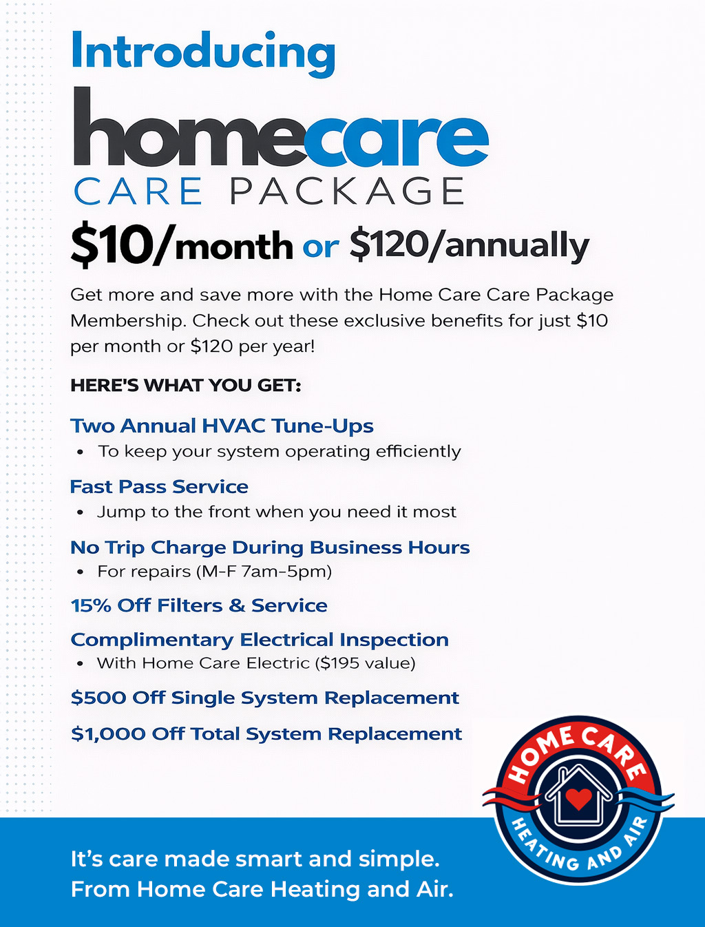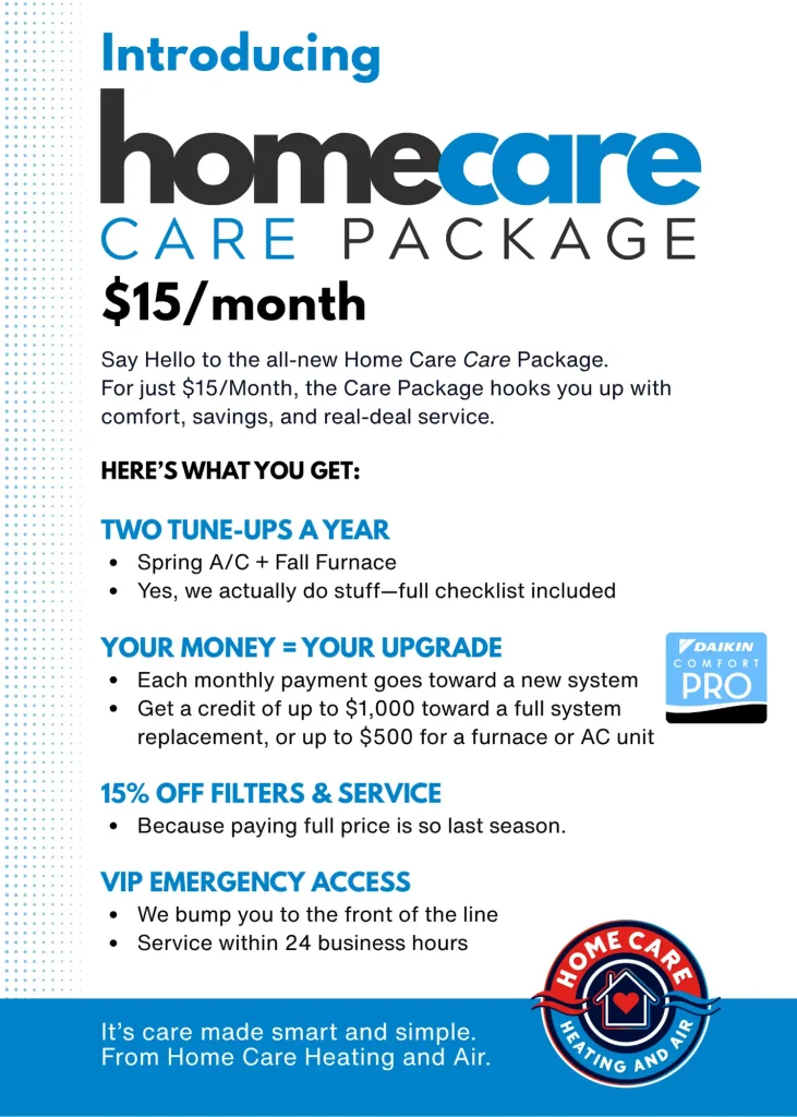 By joining our Care Package membership plan you can save money and have peace of mind knowing you will receive regular maintenance on your heating and cooling system. Discounted maintenance, front of line emergency service, increased system efficiency and longevity are just some of the benefits our Care Package members enjoy. Please contact us today to learn more or sign up!